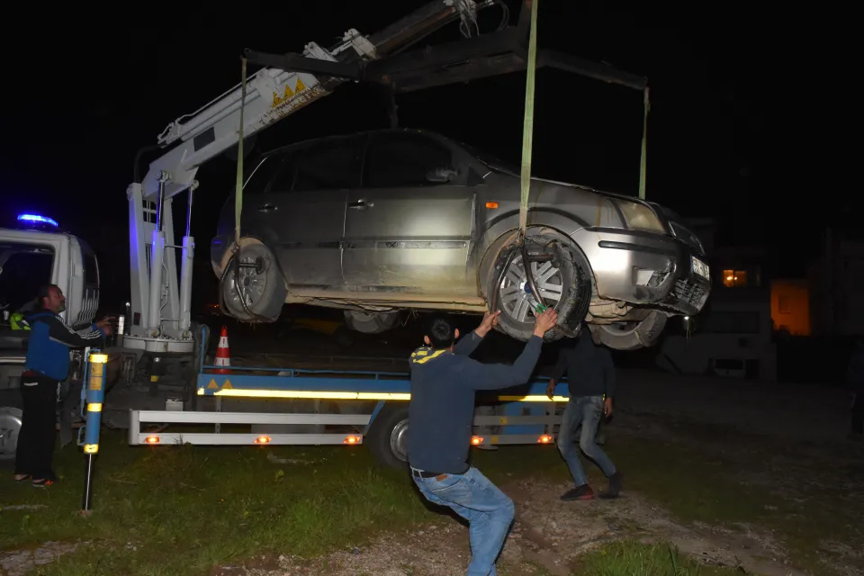 Dere yatağında ters dönen otomobil, vinçle bulunduğu yerden çıkarıldı.