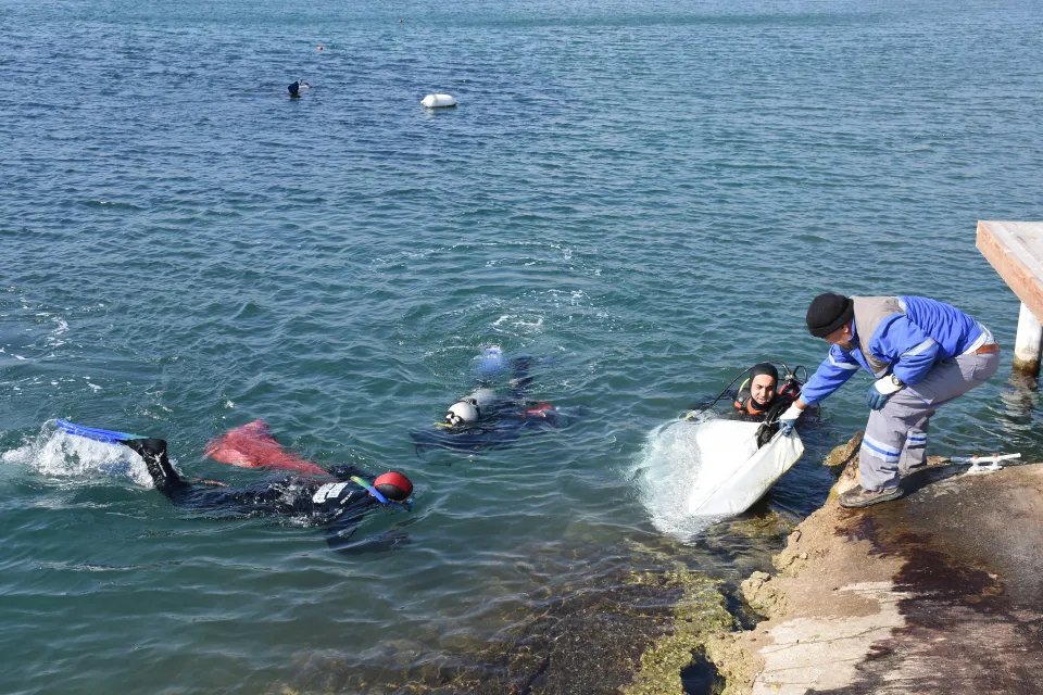 Ortakent limanı ve yakın çevresinde 1,5 saat süren temizlik çalışmasında, su altından araç lastiği, cam ve plastik şişeler, boru, halı, yatak, havası inmiş futbol topu gibi çok sayıda atık çıkarıldı.