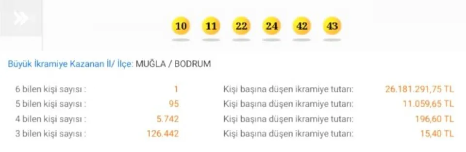 Milli Piyango İdaresi Genel Müdürlüğünden yapılan açıklamaya göre, Süper Loto'da 6 bilen bir kişi 26 milyon 181 bin 291 liranın sahibi oldu. 10, 11, 22, 24, 42, 43 numaralarını tahmin eden talihlinin kuponu Bodrum'dan yatırdığı öğrenildi.