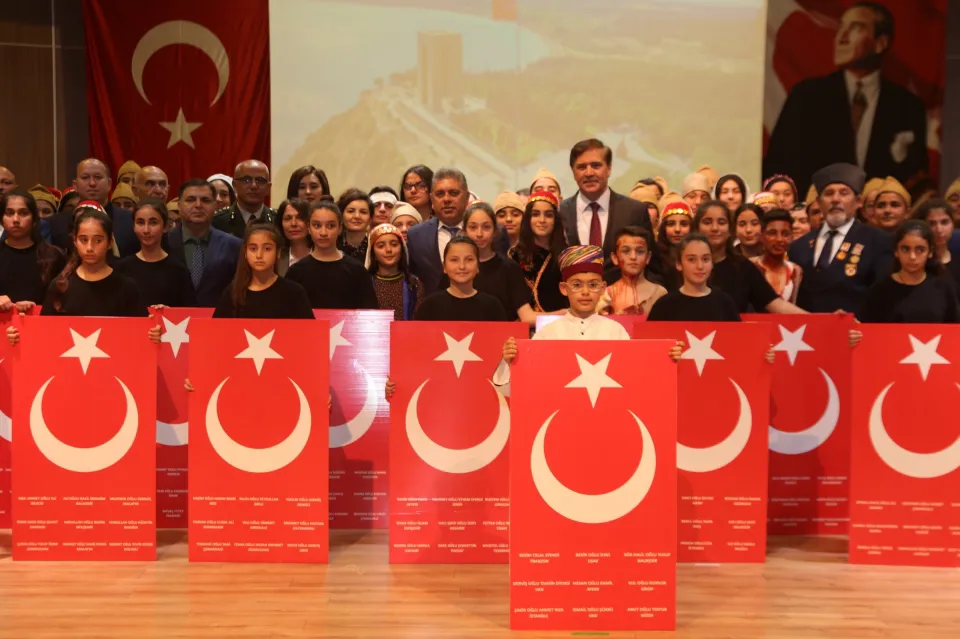 Çanakkale Deniz Zaferi’nin 104. Yılı ve Çanakkale Şehitlerini Anma Günü programı Vedat Türkmen Ortaokulu öğrencilerinin hazırladığı oratoryo gösterisi ile son buldu. Çanakkale Zaferi’nin kazanılmasını anlatan gösteri salonu dolduranlara duygusal anlar yaşattı ve gösteriyi izleyenler gözyaşlarına hakim olamadılar.