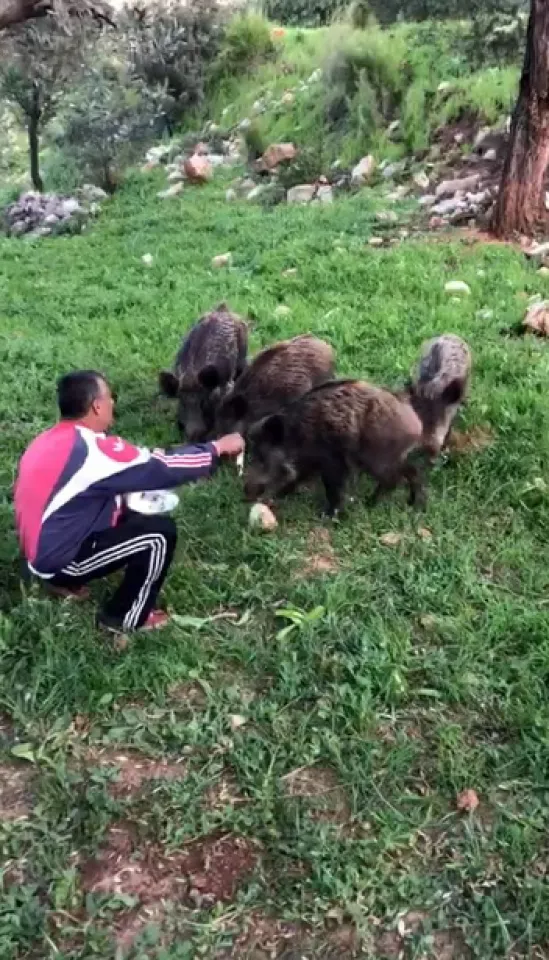 Bodrum ilçesinde bir vatandaşın aç kalan yavru yaban domuzlarına yaklaşarak ekmek verdiği anlar, kameraya yansıdı.