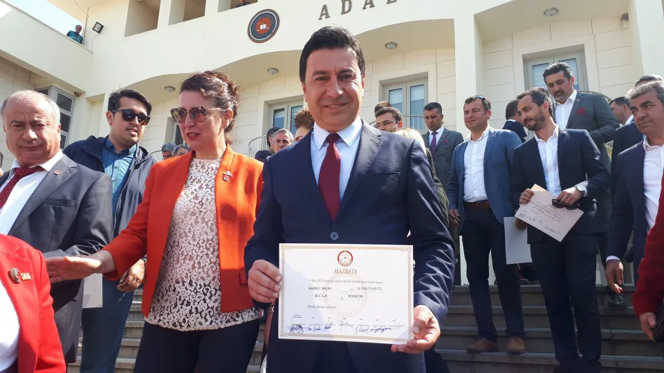 31 Mart yerel seçimlerinde Bodrum Belediye Başkanlığı’na seçilen Ahmet Aras mazbatasını aldı. CHP’nin Belediye Meclis asil üyeleriyle birlikte adliyeye gelen Başkan Ahmet Aras’a mazbatasını İlçe Seçim Kurulu Başkanı Hakim Gül Karaşahin verdi. Adliye girişinde partililer ve vatandaşlar tarafından karşılanan Bodrum’un yeni Belediye Başkanı Ahmet Aras, mazbata töreninden sonra adliye çıkışında gazetecilerin sorularını yanıtladı. “Hayatımda ilk kez böyle bir şey yaşadığım için mazbatayı alırken çok duygulandım.” diyen Başkan Aras, güzel bir seçim döneminin ardından Bodrum’un ve demokrasinin kazandığını belirterek “Artık kaybedecek zamanımız yok.Hemen çalışmaya başlıyoruz” şeklinde konuştu.