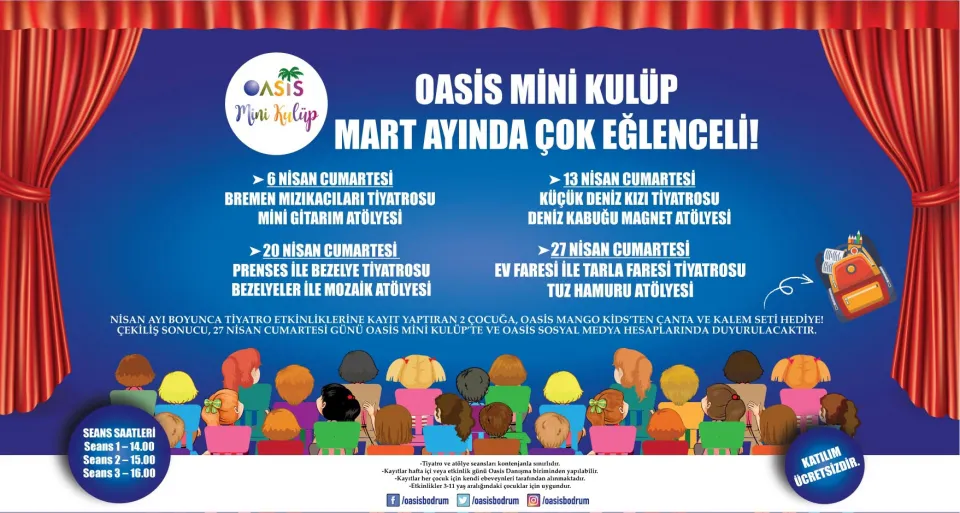 “Oasis Mini Kulüp’te, çocukların hayal dünyasını geliştiren ve sosyalleşmelerine katkıda bulunan tiyatro ve atölye etkinlikleri nisan ayında da devam ediyor. Birbirinden eğlenceli tiyatrolar, atölyeler ve sürprizlerle dolu ‘Oasis Mini Kulüp’ nisan ayı boyunca her cumartesi minik ziyaretçilerini ağırlayacak. Tiyatro ve atölye etkinliklerine katılım sağlayan iki çocuk Mango Kids’ten çanta ve kalem seti kazanma şansını yakalayacak.”