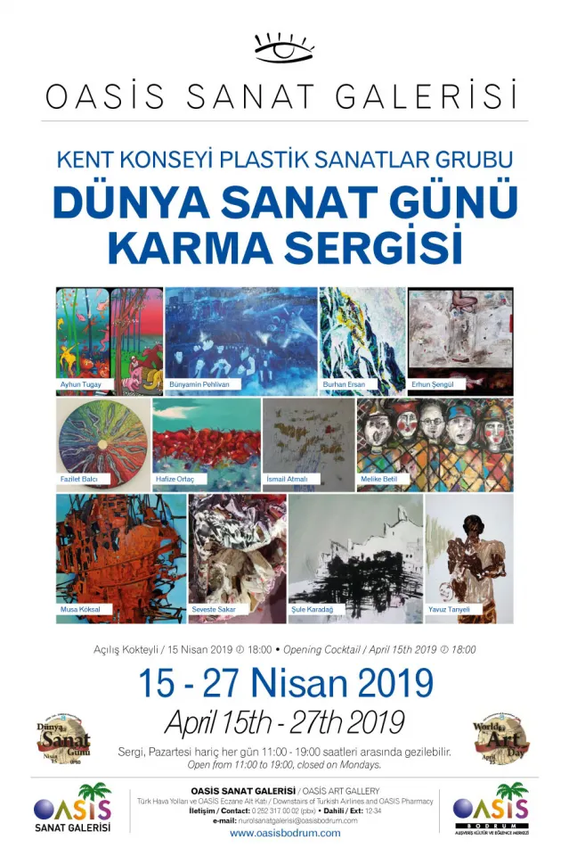 15 Nisan Dünya Sanat Günü’nde Kent Konseyi Plastik Sanatlar Grubu Karma Sergi ile Oasis Sanat Galerisi’nde ziyaretçileri ile buluşuyor. Ayhun Tugay, Bünyamin Pehlivan, Burhan Ersan, Erhun Şengül, Fazilet Balcı, Hafize Ortaç, İsmail Atmalı, Melike Betil, Musa Köksal, Sevestet Sakar, Şule Karadağ, Yavuz Tanyeli gibi isimlerin eserlerinden oluşan sergi, 15 Nisan Pazartesi saat 18.00’de başlayacak kokteyl ile açılacak ve 27 Nisan 2019 tarihine kadar, pazartesi hariç hergün 11.00-19.00 saatleri arasında ziyaret edilebilecek.