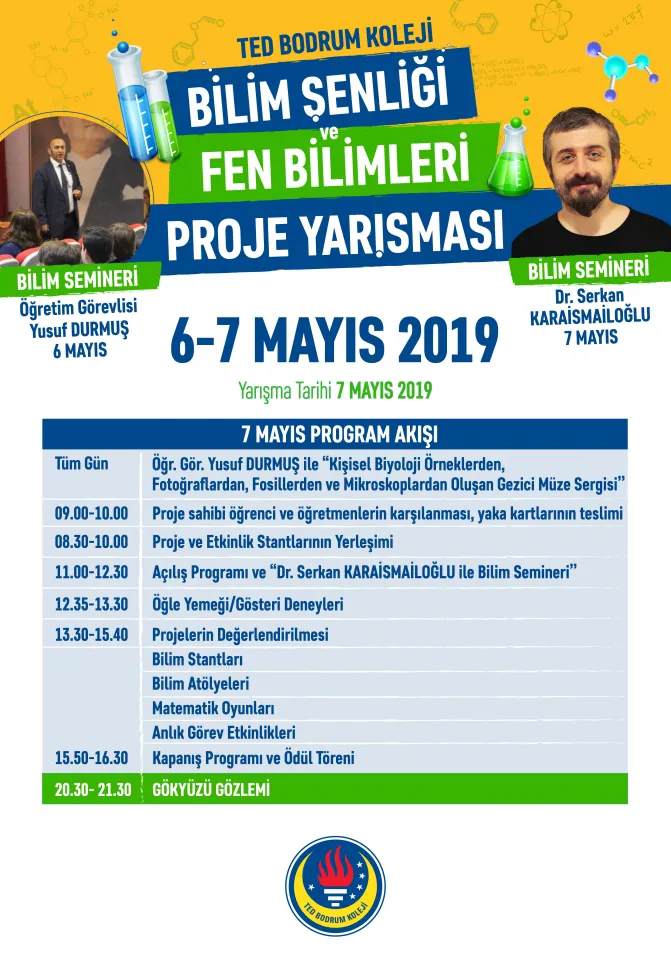 6 Mayıs'ta Hacettepe Üniversitesi Öğretim Görevlisi Yusuf Durmuş'un öğrenciler için gerçekleştireceği bilim seminerinin ardından 6-7 Mayıs tarihlerinde hem TED Bodrum Koleji öğrencileri hem de misafir okullara açık olacak olan ’Kişisel Biyoloji Örneklerden, Fotoğraflardan, Fosillerden ve Mikroskoplardan Oluşan Gezici Müze Sergisi’’ gezilebilecek.