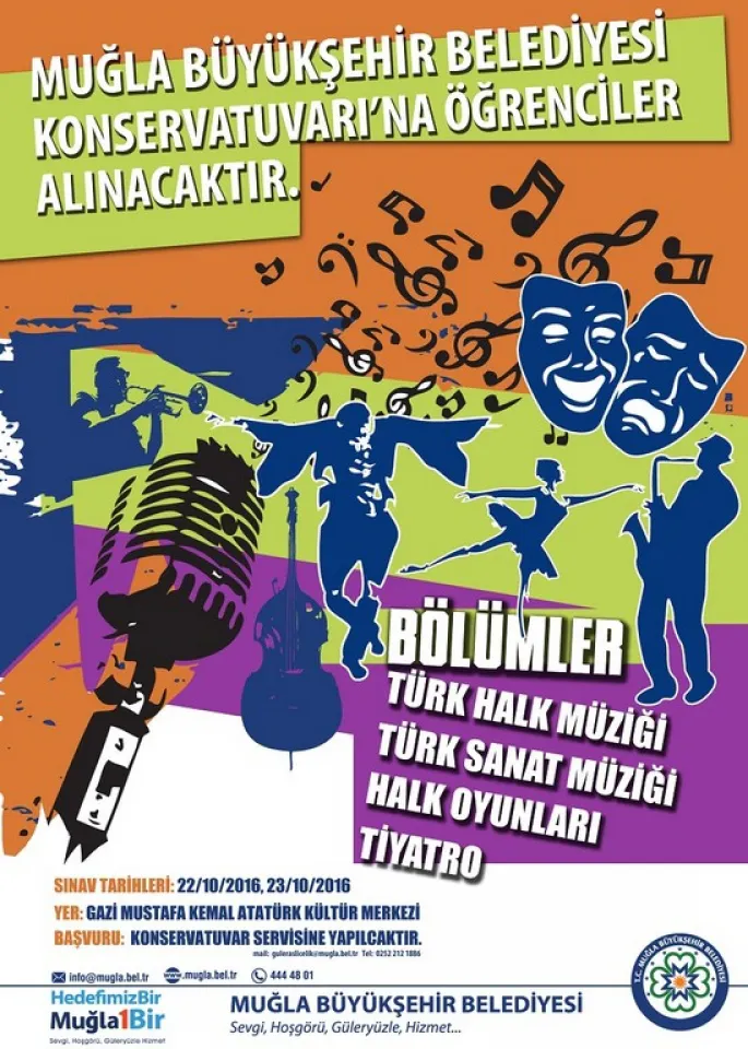 Muğla Büyükşehir Belediyesi Konservatuarı’na katılımlar için sınavlar 22-23 Ekim’de yapılacak. Muğla Büyükşehir Belediyesi Konservatuarı’nın öğrenci alımları başladı. Türk Halk Müziği (THM), Türk Sanat Müziği (TSM), Halk Oyunları ve Tiyatro dallarında alınacak öğrenciler 3 yıllık eğitimin sonunda sertifika alacaklar. Herhangi bir eğitim düzeyinde olma zorunluluğu olmayan konservatuar sınavları 22-23 Ekim tarihlerinde yapılacak.