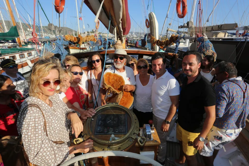 Bodrumlu sünger avcısı Aksona Mehmet, yeni nesillere sünger avcılığını aktarmak için çıktığı Bozcaada seferinin ardından Bodrum'da törenle karşılandı.