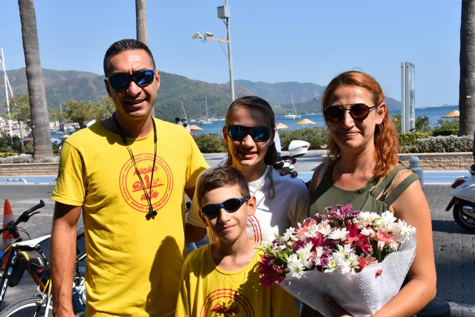 Bisikletleriyle 27 günde bin 450 kilometre yol giderek Göbeklitepe'ye ulaşan ve kendilerine "Küçük 1 aile" adını veren Pekçedenöz ailesi, Marmaris'e döndüklerinde belediye çalışanları tarafından çiçeklerle karşılandı.