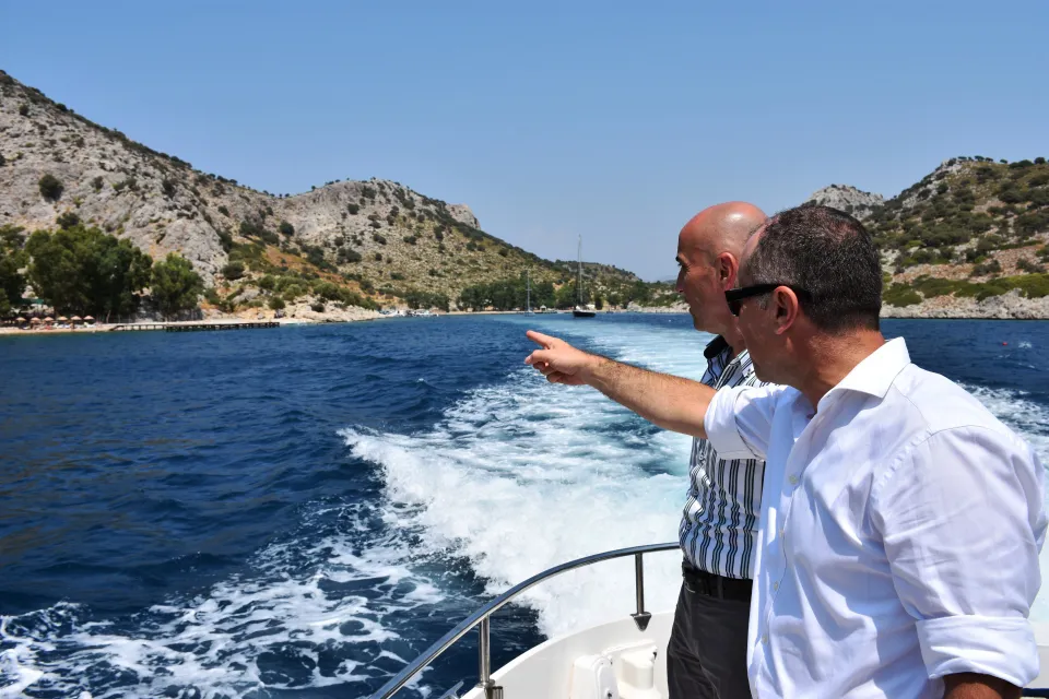 Tabiat Varlıklarını Koruma Genel Müdürü Mehmet Ali Kahraman, Muğla Çevre ve Şehircilik İl Müdürü Ömür Özdil ile bağlı ekipler, iki ilçede Sahil Güvenlik Komutanlığına ait tekneyle kıyı ve koylardaki kaçak yapılaşmaya ilişkin denetim yaptı.