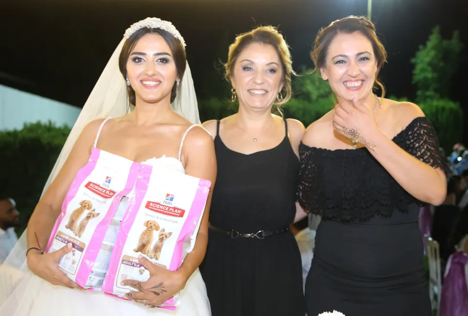 Muğla'da sokak hayvanları için mama günü düzenleyen "Dostlara Mama" grubu üyesinin düğün töreninde, arkadaşları geline altın yerine 30 kilogram köpek maması hediye etti.