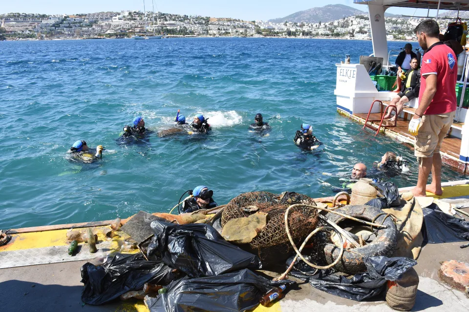 Bodrum'daki bir dalış merkezinin organizasyonu ile hafta sonu dalış yapmak üzere İstanbul'dan gelen iki dalış okulundan dalgıçlar, "15 Eylül Dünya Temizlik Günü" kapsamında deniz dibi temizliği yaptı.