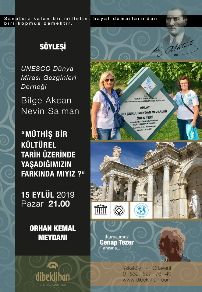 Dibeklihan Kültür ve Sanat Köyü’nde UNESCO Dünya Mirası Gezginleri Derneği’nden Bilge Akcan ve Nevin Salman’la bir söyleşi gerçekleşecek. 15 Eylül 2019 Pazar akşamı saat 21:00’da Dibeklihan Orhan Kemal Meydanı’nda gerçekleşecek olan söyleşide UNESCO Dünya Mirası listesine girmeye aday eserler konuşulacak.