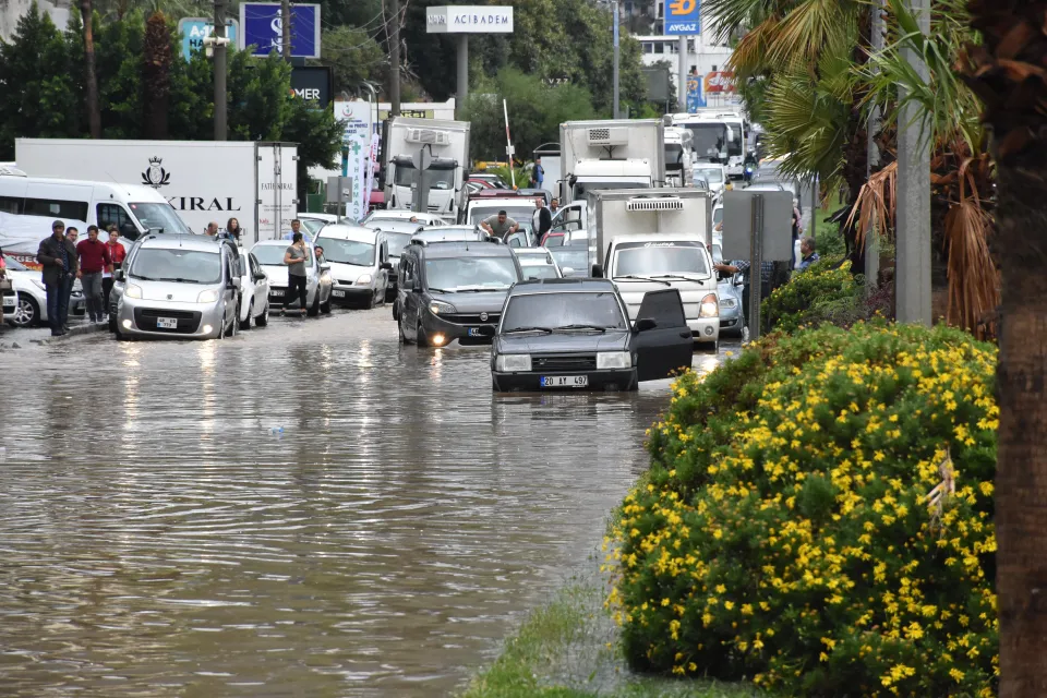Bodrum ilçesinde etkili olan sağanakta kara yolu trafiğe kapandı, su taşkınları meydana geldi.