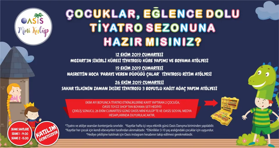 Etkinlikler, 12 Ekim Cumartesi günü, “Mozart’ın Sihirli Küresi Tiyatrosu ve Küre Yapımı ve Boyama Atölyesi” ile başlayacak, 19 Ekim Cumartesi günü, “Nasrettin Hoca Parayı Veren Düdüğü Çalar Tiyatrosu ve Ritim Atölyesi”, 26 Ekim Cumartesi günü, “Sakar Tilkinin Zaman İksiri Tiyatrosu ve 3 Boyutlu Kağıt Ağaç Yapım Atölyesi” ile devam edecek. Oasis Mini Kulüp’te gerçekleşen tiyatro ve atölye etkinliklerine katılım sağlayan iki şanslı çocuk, ay sonunda Oasis Toyzz Shop’tan boyama setinin sahibi olacak.