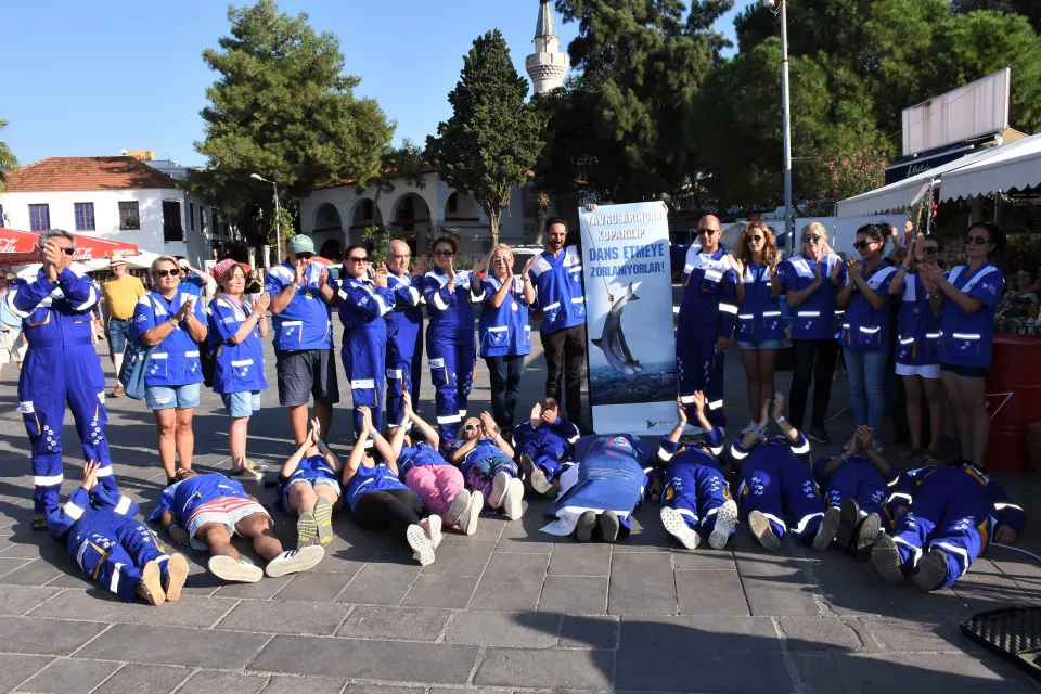 Bodrum ilçesinde, Hayvan Hakları Federasyonu (HAYTAP) temsilcileri yere yatarak yunus parklarını protesto etti.