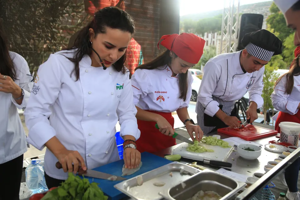 Ardından şefler, Muğla'nın ilçelerinden katılan kadınların zeytinyağlı yemek yarışmasında sunduğu yemekleri değerlendirdi.