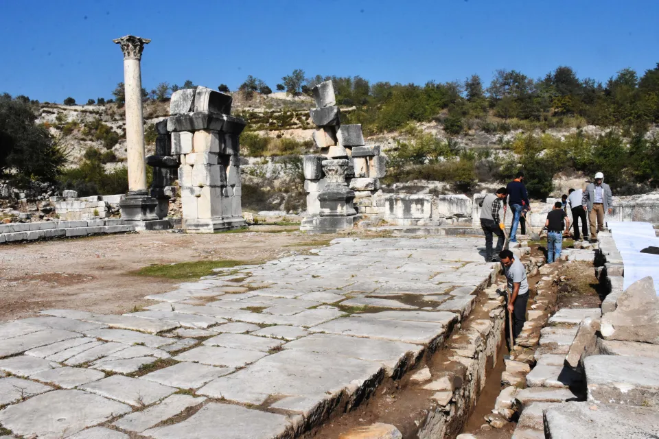 Antik Kentteki Kuzey Şehir Caddesi'nde Yatağan Kaymakamlığı ve Güney Ege Kalkınma Ajansı (GEKA) ile proje yürüttüklerini aktaran Söğüt, bu kapsamda caddede hem kazı hem konservasyon hem de restorasyon çalışması yaptıklarını bildirdi.
