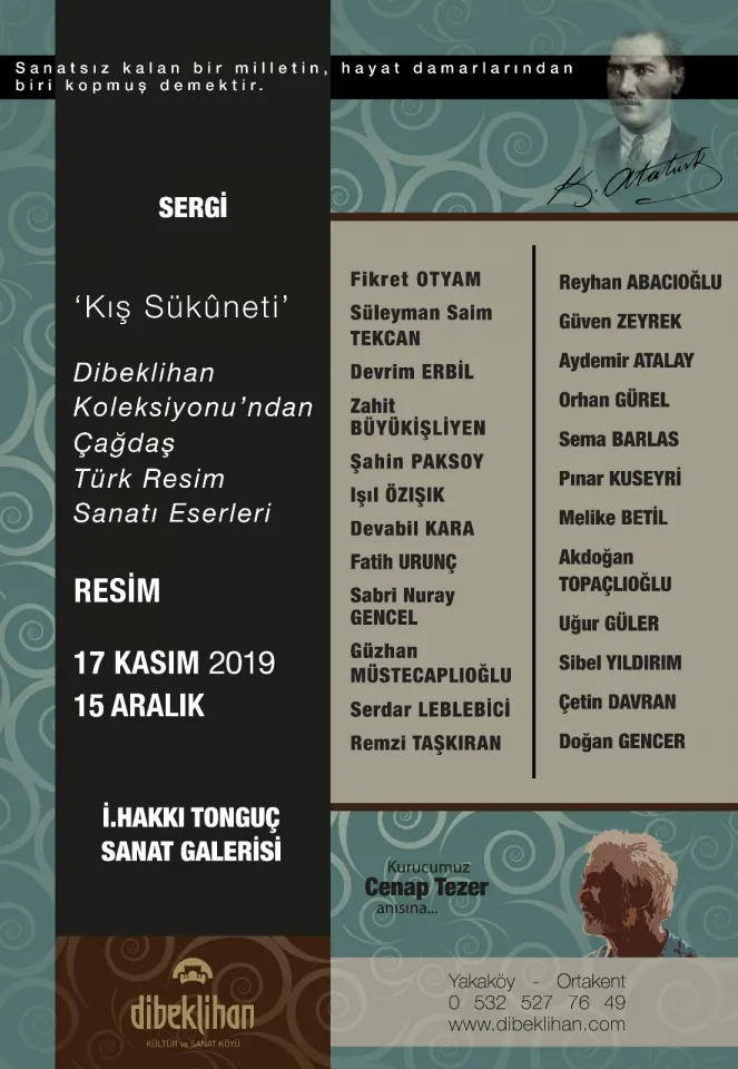 Dibeklihan Kültür ve Sanat Köyü kış aylarında da sanatsal faaliyetlerine devam ediyor. İsmail Hakkı Tonguç Sanat Galerisi’nde “Kış Sükuneti” temasıyla Dibeklihan’ın Özel Koleksiyonu’ndan seçilen Çağdaş Türk Ressamları’na ait 24 Sanatçı’nın eserleri yer alacak. 17 Kasım 2019 Pazar günü saat 15:00’da açılacak olan sergi, 15 Aralık 2019 gününe kadar pazartesi günleri dışında her gün 10:00 ile 18:00 saatleri arasında gezilebilecek.