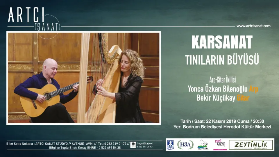 Arp ve Gitar…Nadiren bir araya gelen bu iki özel enstrüman, özellikle son on yılda, yeni tınıların arayışında olan sanatçıların ilgisini çekmiştir. İçlerinde bir çok türün öğelerini barındırarak, günümüz dünya müziği tarzında yazılan eserler, doğudan batıya geniş bir renk paleti sunmaktadır. Arpist Yonca Özkan Bilenoğlu ve Gitarist Bekir Küçükay, bu konserde farklı kültürlerde yetişen bestecilerin orijinal eserlerini dinleyici ile buluşturuyor. Konserimizde görüşmek üzere…”