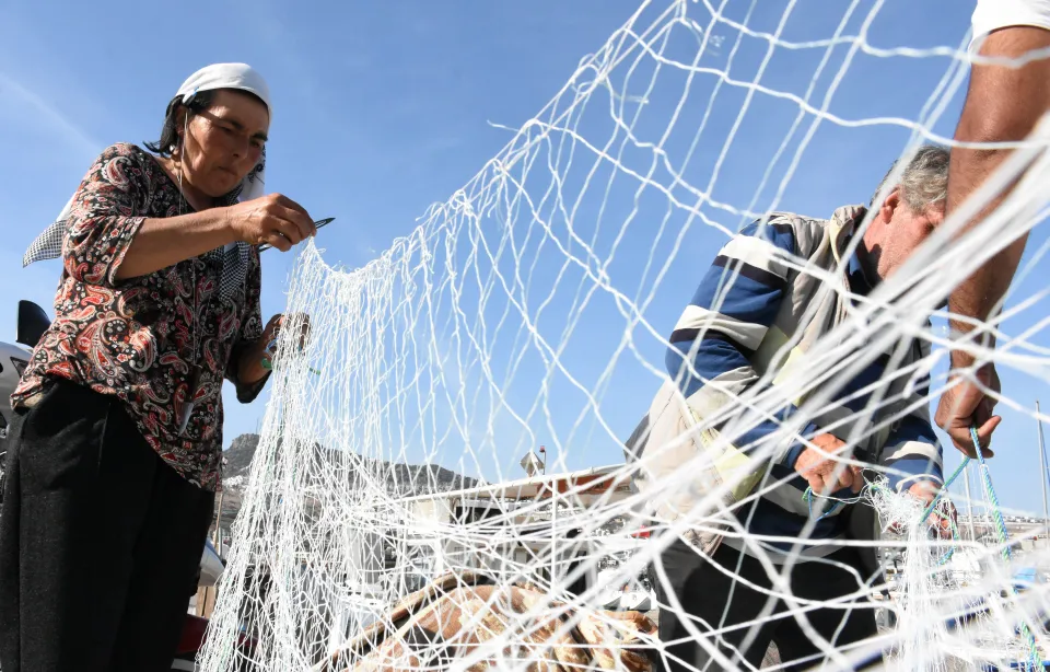 Kadınlar, ev işlerini bitirip hayvanlarının bakımını yaptıktan sonra ağ tamiri için limana geliyor.