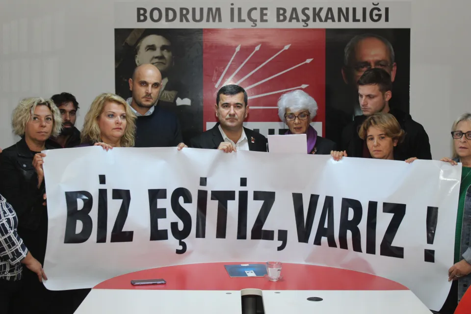 CHP Bodrum İlçe Başkanlığı parti binasında yapılan basın açıklamasına CHP Bodrum İlçe Başkanı Halil Karahan, Bodrum Belediyesi Başkan yardımcısı CHP’li Emel Çakaloğlu, CHP Bodrum İlçe Örgütü Kadın Kolları Başkanı Semahat Berber, yönetim kurulu üyeleri ve partililer katıldı.
