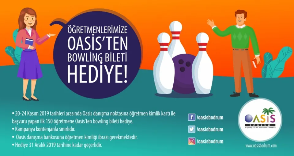 “Oasis Bodrum Alışveriş Kültür ve Eğlence Merkezi, bilginin kaynağı olan öğretmenlere bu öğretmenler gününde keyifli zaman geçirmelerini sağlayacak bir hediye hazırladı. 20-24 Kasım 2019 tarihleri arasında öğretmenler gününe özel düzenlenen kampanya kapsamında Oasis danışma noktasına başvuran ilk 150 öğretmene, tek kişilik bowling bileti hediye edildi!” Her mevsim alışverişin en güzel halinin yaşandığı Oasis Bodrum Alışveriş Kültür ve Eğlence Merkezi, geleceğimizin mimarı olan öğretmenlere özel hediye bowling kampanyası düzenledi. Öğretmenler gününe özel sunulan kampanya kapsamında, 20-24 Kasım 2019 tarihleri arasında, alışveriş merkezini ziyaret eden ve öğretmen kartı ile Oasis danışma noktasına başvuru yapan ilk 150 öğretmene, tek kişilik bowling bileti hediye edildi. Hediye biletlerini teslim alan öğretmenler, Bodrum’un tek bowling kafesi olan Oasis Bowling’de oyun oynarken ara tatilin tadını doyasıya çıkardı. Hediye biletler, 31 Aralık 2019 tarihine kadar geçerli olmaya devam edecek.