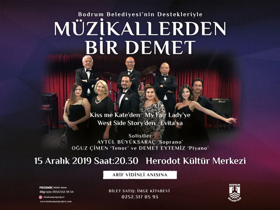 Bodrum Belediyesi destekleriyle PEKDEMİR Kültür & Sanat tarafından düzenlenen ‘Operet ve Müzikallerden bir demet’ konseri 15 Aralık akşamı saat 20.30 da Bodrum Herodot Kültür Merkezinde gerçekleşecek. İzmir Devlet Opera ve Balesi Müdürü ve solist sanatçılarından Aytül Büyüksaraç ve Oğuz Çimen ile İzmir Devlet Konservatuvarı Piyano öğretim görevlisi Demet Eytemiz’in solist olarak katılacağı ‘Operet ve Müzikallerden bir demet’ konserinde bazı operet ve müzikallerden eserler seslendirilecek. Konser sırasında Ahmet Şener tarafından projeksiyon gösterisi olacak. Kemanda Zeynep Simge Eytemiz, Klarinette Atıf Peynirci, Bas da Suudi Kunduz, Davul da Mehmet Kızılateş yeralıyor. Ayrıca Altan Kılınç, İpek İbrahimoğlu ve Melodi Sıcakyüz Olataş’tan oluşan bale gurubu da programda gösteriler sunacak.