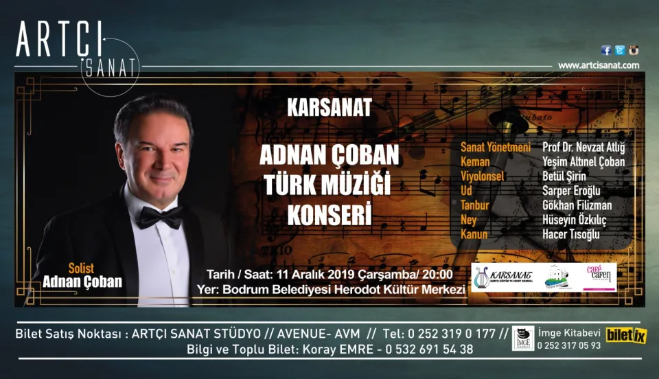 Karsanat (Karya Kültür ve Sanat Derneği) klasik batı müziği konserlerinin ardından, bu kez de sezonun ilk Türk müziği konserini , son dönemin en başarılı solistlerinden Dr. Adnan Çoban ve altı kişilik tanınmış saz sanatçılarından oluşan grubun eşliğinde gerçekleştiriyor.