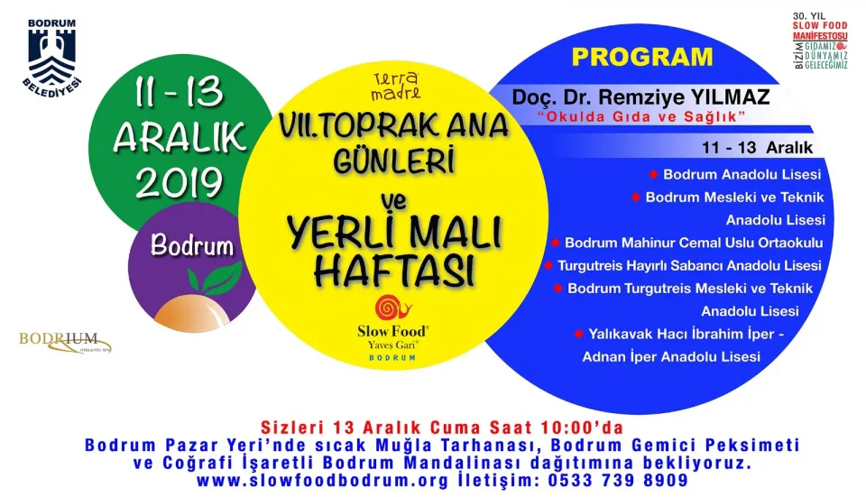 Her sene 10 Aralık’ta Slow Food tarafından dünya çapında kutlanan TerraMadre- Toprak Ana Günü kapsamında, yerel gıdanın dünya çapında fark edilmesi ve kutlanması amacıyla gerçekleştirilen etkinlikler, bu sene Bodrum’da 7’nci kez düzenlenecek. Pozitif küreselleşmeyi temsil eden ve tarımdaki endüstrileşmeyi ile yemek kültürlerinin tek düzeliğini reddeden Toprak Ana Günü’nde geleneksel Pazar yeri ikramları gerçekleştirilecek.