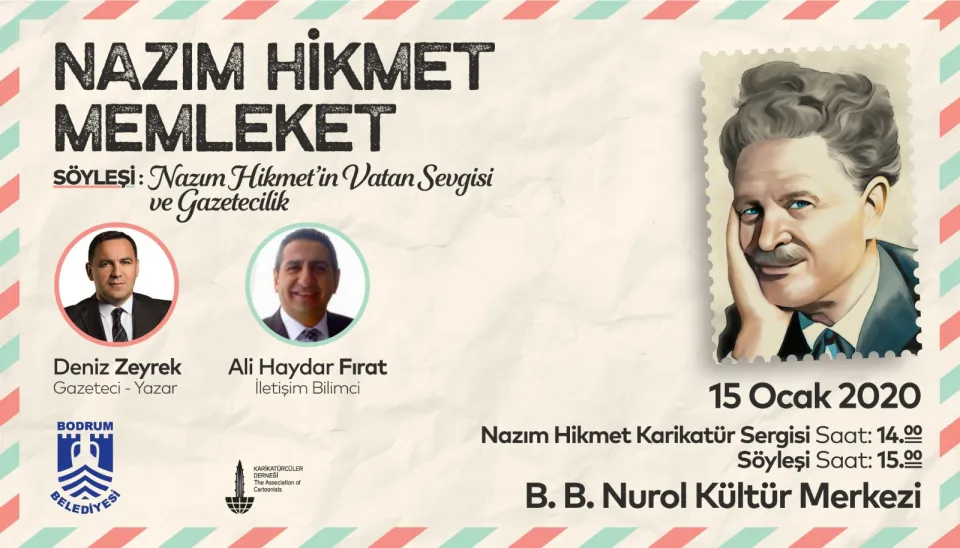 Bodrum Belediyesi tarafından düzenlenen “Nazım Hikmet Memleket” konulu söyleşi, 15 Ocak 2020 Çarşamba günü Nurol Kültür Merkezi’nde gerçekleştirilecek. İletişim Bilimci Ali Haydar Fırat ve Gazeteci-Yazar Deniz Zeyrek konuşmacı olarak katılacağı ve “Nazım Hikmet’in Vatan Sevgisi ve Gazetecilik” konulu söyleşi saat 15.00’te başlayacak. Söyleşiden hemen önce ise Karikatürcüler Derneği’nin “Nazım Hikmet Karikatür Sergisi”nin açılışı gerçekleşecek. Sergi, saat 14.00’ten itibaren Bodrumlulara kapılarını açacak.