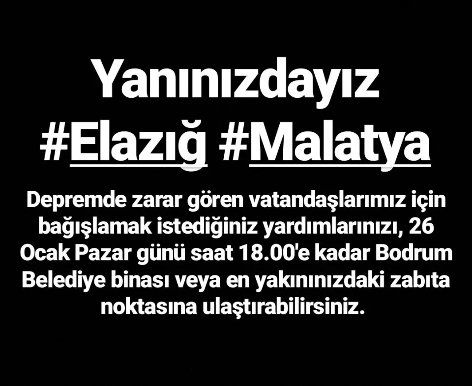 Bodrum Belediye Başkanlığı’ndan Bodrum halkına yapılan duyuruda, afet bölgeleri olan Elazığ ve Malatya’ya battaniye, kışlık bot ve mont, temiz giysi, katalitik, ısıtıcı, çadır, uyku tulumu, çocuk bezi ve gıda gibi temel ihtiyaç malzemesi yardımında bulunmak isteyen vatandaşların, bu malzemeleri 26 Ocak Pazar günü saat 18.00’e kadar Belediye Binası önüne ya da zabıta noktalarına teslim edebileceği bildirildi.