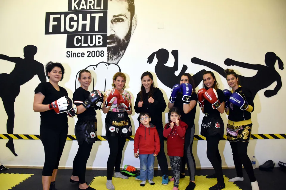Bodrum ilçesindeki muaythai, kick boks, tekvando ve boks merkezine kaydolan 30 ile 42 yaş aralığındaki kadınlar, spor yapmak ve kilo vermek için başladıkları kick boksta keyifli dakikalar geçiriyor.