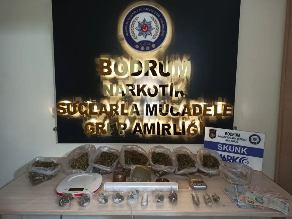 Cumhuriyet Başsavcılığı koordinesinde, villa ve belirlenen iki araçta yapılan aramada iki hassas terazi, 600 gram skunk ve suçtan elde edildiği değerlendirilen yaklaşık 13 bin liraya el konuldu.