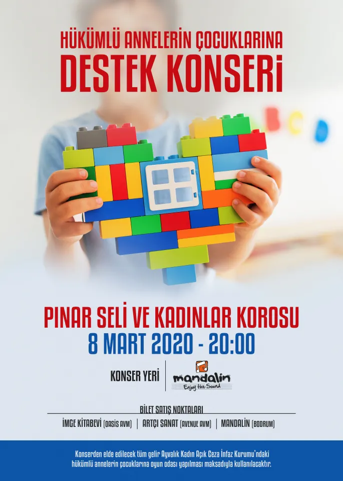 8 Mart 2020 Pazar akşamı Mandalin Bar'da gerçekleşecek konser 20.00’da başlayacak. Konserden elde edilen gelir ile Ayvalık Açık Tip Cezaevi Kadın Hükümlü Çocukları için cezaevi içerisindeki bir oda oyun evi olarak tefriş edilecek.
