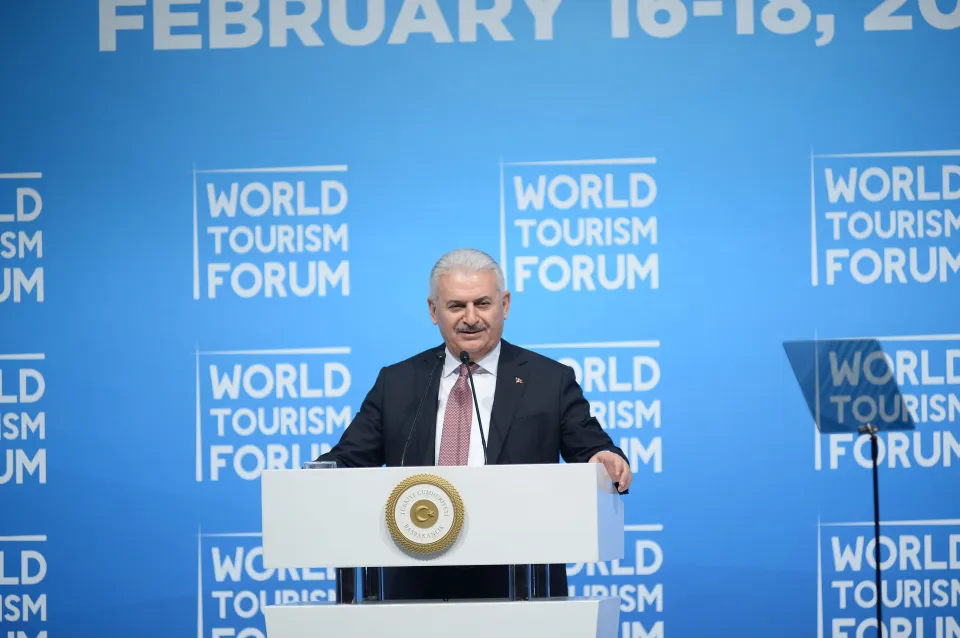 İstanbul Kongre Merkezi'nde düzenlenen Dünya Turizm Forumu'na Başbakan Binali Yıldırım'ın yanı sıra Kültür ve Turizm Bakanı Nabi Avcı, İstanbul Valisi Vasip Şahin, İstanbul Büyükşehir Belediyesi Kadir Topbaş , TÜRSAB Başkanı Başaran Ulusoy ve çok sayıda yerli ve yabancı turizmci katıldı. Başbakan Binali Yıldırım, konuşmasına espri yaparak başladı. Konuşma notunun karışmış olduğunu söyleyen Başbakan Yıldırım, "Sıraları karışmış neyse boşver, Temel konuşma yapmaya niyetlenmiş kürsüye davet etmişler notları birbirine karışmış bir türlü başlayamıyor. Buraya gelirken ne konuşacağımı bir Allah bir ben biliyordum. Şimdi artık sadece Allah biliyor." deyince salondakiler güldü. Başbakan Binali Yıldırım Turizmin bütün ülkelerin ekonomi ve kültürünün gelişimi için çok önemli sektör olduğunu söyleyerek; "Yeni ufuklar yeni turizm sezonunun ülkelerimiz için bereketli olmasını Mevlamdan niyaz ediyorum. Dünya Turizm Formunun bu yıl üçüncüsü gerçekleşiyor. Bu yılki toplantıda üç bini aşan dünyanın değişik yerlerinde katılımcı olmak üzere toplamda 11 bin civarında misafiri ağırlıyoruz. Dünyanın dört bir köşesinden gelen misafirlerimiz var. Dünyanın bütün renkleri bütün değişik kültürleri bir arada bugün küresel turizm konuşacağız." dedi. İstanbul'un son yıllarda dünya üzerinde adından söz ettiren bir şehir olduğunu söyleyerek; "Mutlaka İstanbul'u gezin İstanbul'un güzelliklerini keşfedin. Turizm dünyanın belli başlı endüstrilerinden birisi olma yolunda hızla ilerliyor. 90'lı yıllların sonunda gelişmeler baktığımızda çarpıcı farkları görüyoruz. Turizm sektörü hizmet sektörü alanında birinci sırada. 1980 yılında yabancı ülkelere turistik amaçla seyahat eden ziyaretçi sayısı 260 milyon civarında . Bugün bu sayı 1 milyar 200 milyona ulaşmış nerdeyse dünya nüfusunun 5'te biri bir başka ülkeye seyahat ediyor. 2023'te bu rakam 1.8 milyar olacak. Dünya ülkeleri olarak bu değişime ayak uydurmak, gerekli tedbirleri almak bunu da el birliğiyle geliştirmek mecburiyetinde. Gelen misafirlerimizin beklentilerine ortak çözümler üreteceğiz. Bu forumlar sayesinde katılımcıların iletişimi arttırıyor. Bu anlamda küresel barışa ve kardeşliğe katkı sağlıyor. Kişi bilmediğine düşman olur. İnsanlar bir araya gelirse kardeş olursa güzel anılar bırakırsa kavga olmaz karışıklık olmaz anlaşmazlık olmaz. Daha önce gittiğiniz ülke hakkında karar alırken zihninizde o ülkeyi canlandırırsınız alacağın kararı da buna görev verirsin. Turizm barış için kardeşlik için önemli bir sektör faaliyettir. Çaba gösteren herkesi gönüllü barışı elçisi olarak kabul ediyorum." dedi.