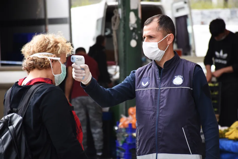 Gümbet Mahallesinde pazar günleri kurulan semt pazarının giriş ve çıkış noktalarında zabıta ekiplerince önlem alındı. Önlemler kapsamında müşterilerin ateşleri ölçülerek ve maske taktırılarak pazar yerine girişlerine izin verildi.