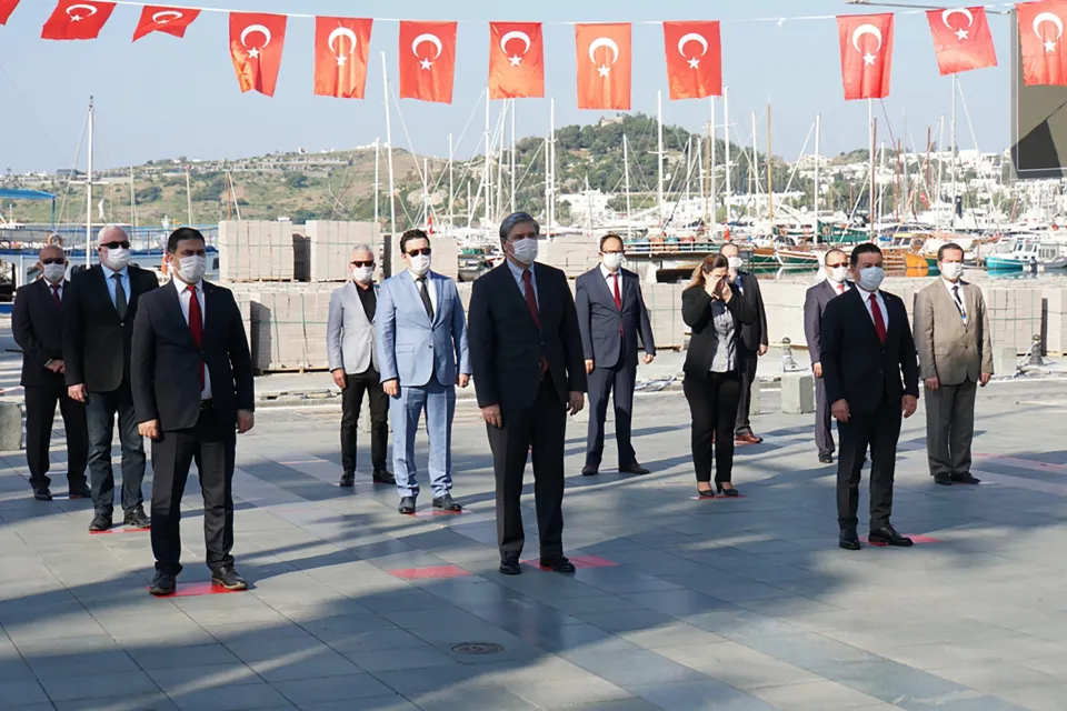 Bodrum İlçe Milli Eğitim Müdürlüğü tarafından düzenlenen törene Bodrum Kaymakamı Bekir Yılmaz, Bodrum Belediye Başkanı Ahmet Aras, Bodrum Belediye Başkan Yardımcısı Emel Çakaloğlu, İlçe Milli Eğitim Müdürü Aslan Korkmaz, siyasi parti temsilcileri, daire amirleri, çeşitli oda ve STK temsilcileri ile emniyet mensupları katıldı.