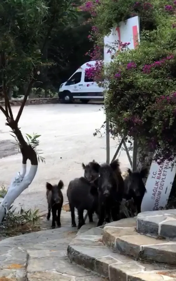 Bodrum ilçesinde, aç kalan yaban domuzu sürüsü devlet hastanesi bahçesinde görüntülendi.