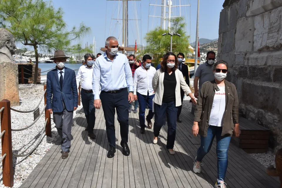 Bakan Ersoy, bazı temaslarda bulunmak için geldiği turistik ilçede, Bodrum Kalesi'ndeki restorasyon çalışmalarını inceledi, yetkililerden bilgi aldı.