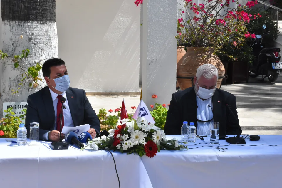 Belediye Başkanı Aras ve Bodrum Kent Konseyi Başkanı Arif Yılmaz, kıyılarda yaşanan izinsiz müdahale ve kaçak yapılarla ilişkin, belediye binası önünde basın toplantısı düzenledi.