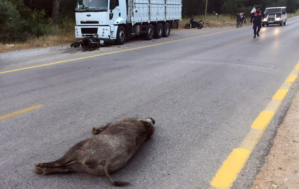 Domuzun telef olduğu kazada, sürücü Alyar ile motosikletteki Melike Yurdagül yaralandı.
