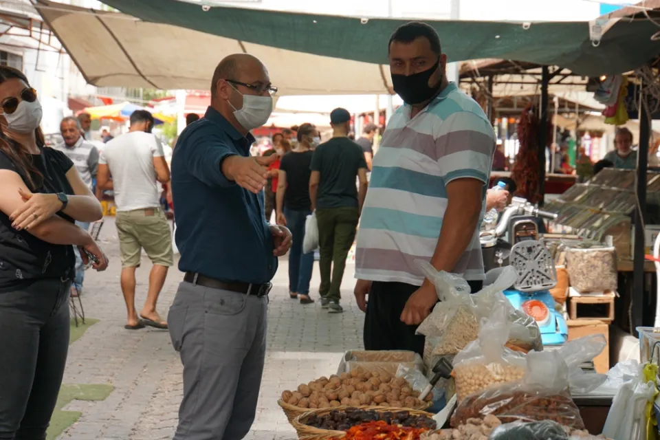 Bodrum Belediyesi, koronavirüs (Kovid-19) salgını tedbirleriyle birlikte pazaryerlerinde alınan önlemleri ve esnafın uyması gereken standart kuralları denetlemeye devam ediyor.
