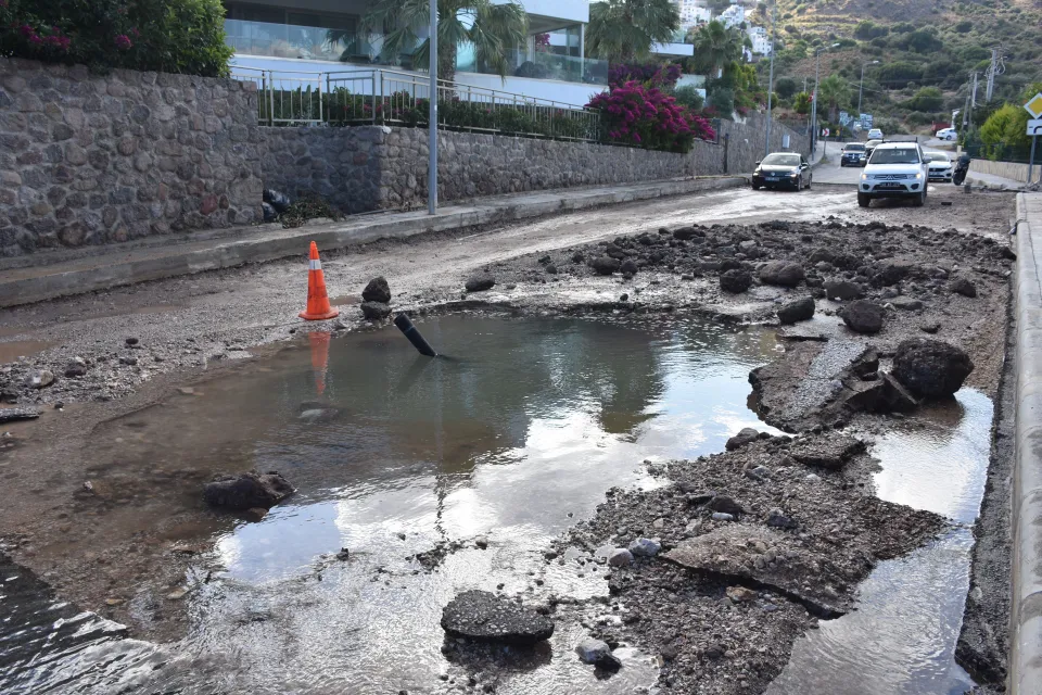 Bodrum ilçesinde, içme suyu hattında yaşanan patlama sonrası yolda hasar meydana geldi.