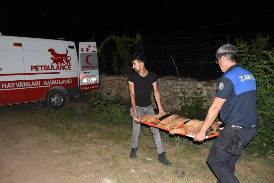 Vücudunun çeşitli yerlerinden ısırık darbeleriyle yaralanan sahibi, köpeği güçlükle arazi içerisindeki eve sokmayı başardı. Müdürlüğe ait sokak hayvanları ambulansı görevlileri ile zabıta ekiplerinin yaptığı çalışmayla sakinleştirici iğne vurulan köpek, daha sonra sedyeyle petbulansa taşındı.