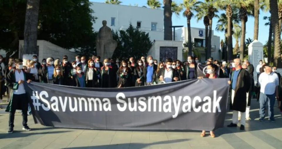 Muğla’nın Bodrum ilçesindeki Belediye Meydanı’nda bu akşam saatlerinde ellerinde Savunma Susturulamaz, Barikatlar Avukatları Durduramaz yazılı pankartlarla toplanan yaklaşık 100 avukat önce oturma eylemi yaptı, ardından basın açıklamasını okudu. Avukatların eylemine CHP Parti Meclisi Üyesi Yalçın Pekşen’de destek verdi.