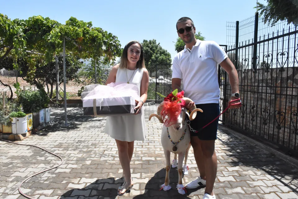 Çağlar Göktaş (27), Konacık Mahallesi'ndeki nişanlısı Damla Özbek'in (25) yaşadığı eve kurbanlık koç götürdü. Kurban Bayramı'na özgü olan ve uzun yıllardır sürdürülen gelenekte, özenle süslenen ve boynuna bilezik bağlanan koç, gelin adayına hediye edildi.