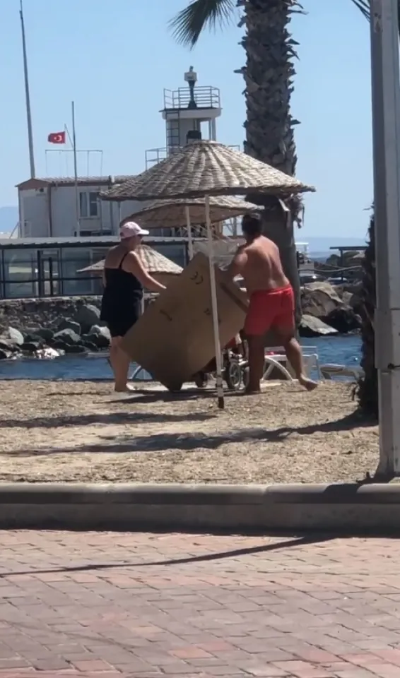 Bir kişi, akülü sandalyesiyle kumda ilerleyemeyen engelliye yardım etti. Her ilerlediğinde tekerleklerin altına karton yerleştiren kişi, engellinin, sahile ulaşmasını sağladı.