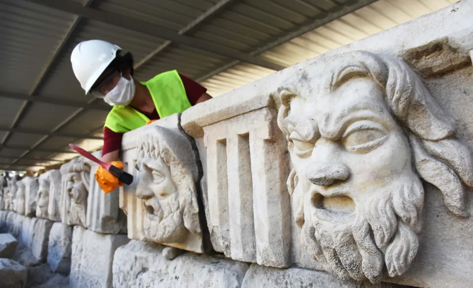 "Bu çalışmalar tamamlandığında maskların tamamını yine tiyatroda sergileyeceğiz. Karşılaşılan tahrip olmuş taş eserler, büyük bir hassasiyetle onarılıyor. Antik tiyatrodaki kazı çalışmalarında bulunan masklar, hem trajedi hem komedi maskları. Normalde bildiğimiz masklardan daha kabarık ve gösterişli durumda. O dönemin kültür ve sosyal hayatıyla mimarisiyle pek çok şeyi bize aktarıyor. Son 2 yılda 33 mask çıkardık ama çalışmalar devam ediyor.