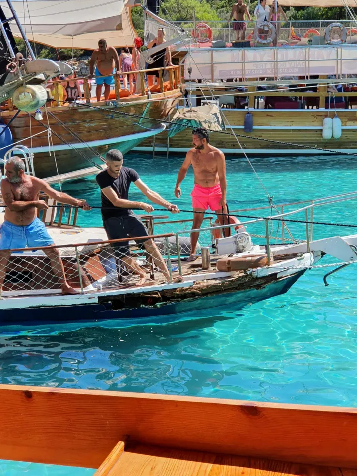 Bodrum ilçesinde mavi turda kayalıklara çarparak su alan gezi teknesi, sığlıkta kıyıya oturdu.