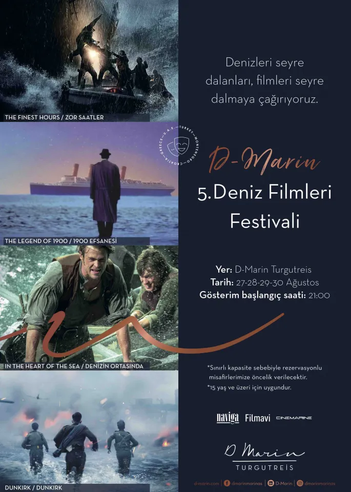 D-Marin Turgutreis’te faaliyet gösteren Cinemarine Açık Hava Sineması’nın ev sahibi olduğu etkinlik, Naviga dergisiyle birlikte hayata geçiriliyor. Beşinci D-Marin Deniz Filmleri Festivali’nin programında sırasıyla Finest Hours (Zor Saatler), Legend of 1900 (1900 Efsanesi), In The Heart of The Sea (Denizin Ortasında) ve Dunkirk yer alacak.